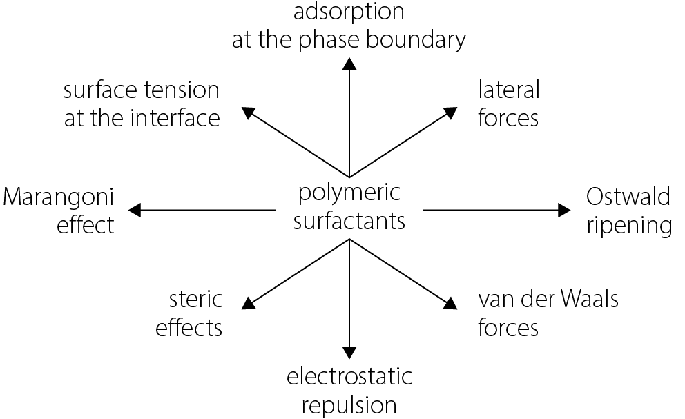 One of the oldest and most widely used groups of polymers influencing phase-boundary properties in dispersed systems are amphiphilic polymers – homopolymers and copolymers obtained through random polymerization. These polymers are characterized by the random distribution of hydrophobic and hydrophilic groups.69 Among them, nonionic polymers can form weak micelles but primarily adsorb at interfaces. Adsorption at the interface alters the interactions between molecules in both phases. These polymers find applications in cosmetics as hydrophilic coatings and emulsion stabilizers.70
