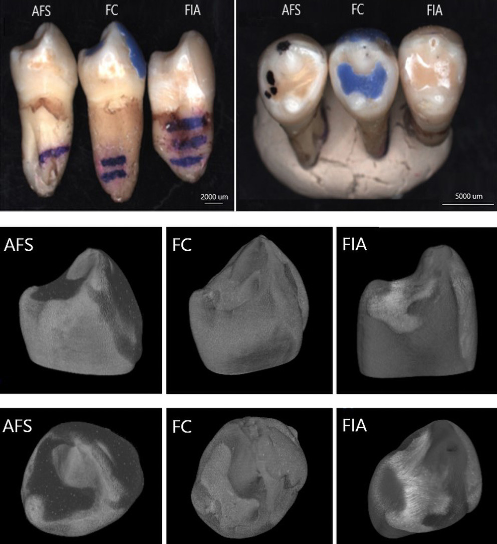In order to investigate the adhesion of fissure sealants to dental tissues, extracted premolars were included in the study. The teeth were prepared in accordance with clinical recommendations, and sealants were applied to the pits and fissures of the occlusal surfaces of the premolar’s crowns (Figure 2). Following polymerization, the sealed teeth were subjected to advanced imaging and characterization techniques, including micro-computed tomography (micro-CT) and SEM, to visualize and evaluate the interfacial adaptation and integrity of the material–tooth
