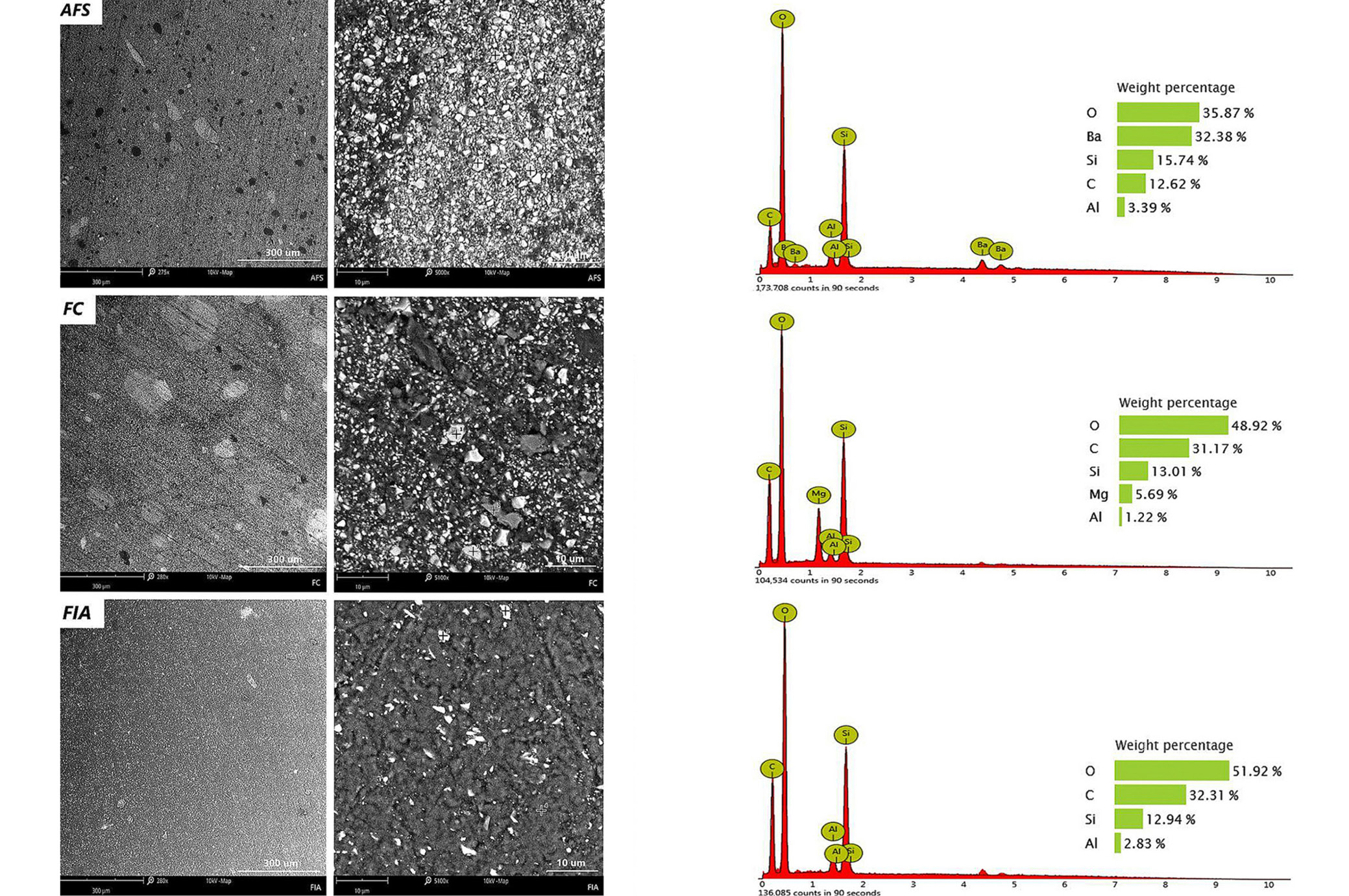 Scanning electron microscopy observations performed at magnifications of ×280 and ×5,000 revealed that the analyzed surfaces were smooth and continuous, without the presence of microcracks within the polymerized material. At higher magnification (×5,000), particularly in AFS and FC sealants, the structure appeared fine-crystalline, containing particles of approx. 0.5–1 μm in size. Spectroscopic analysis identified these particles as silicate phases. The presence of silicon and aluminum in the sealants is most likely derived from silica (SiO₂), which is a commonly applied inorganic filler in dental composite.26 In addition, AFS and FC materials demonstrated minor amounts of titanium and barium, suggesting the incorporation of additives aimed at enhancing radiopacity of the dental materials. In contrast, FIA sealant exhibited the highest carbon content (42.9%) and simultaneously the lowest oxygen content (48.8%), with significantly lower silicon content (6.87%) compared to the other tested materials (Figure 3). The more diversified elemental composition observed in AFS and FC relative to FIA may account for differences in their physico-chemical performance.