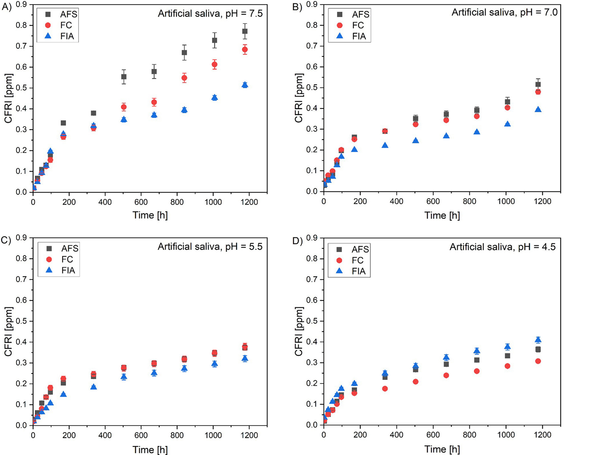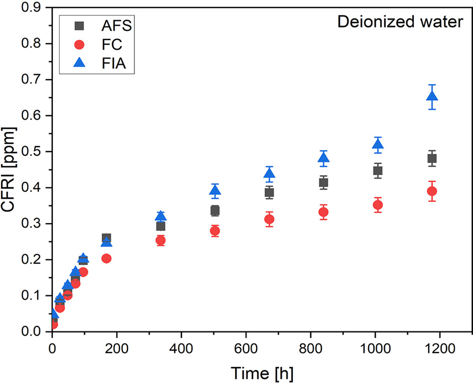 The cumulative fluoride release index (CFRI) value demonstrated an upward trend over time for every solution and every evaluated sealant. Results indicate highest fluoride release in the 1st week of incubation. After 7 weeks of incubation, AFS possessed the highest CFRI in artificial saliva with pH = 7.5 (0.772 ppm) and pH = 7.0 (0.516 ppm). The pH of 5.5 highest CFRI value was comparable for AFS (0.373 ppm) and FC (0.378 ppm). As per artificial saliva with pH = 4.5 and deionized water, highest CFRI was assessed for FIA – 0.408 ppm and 0.651 ppm, respectively.