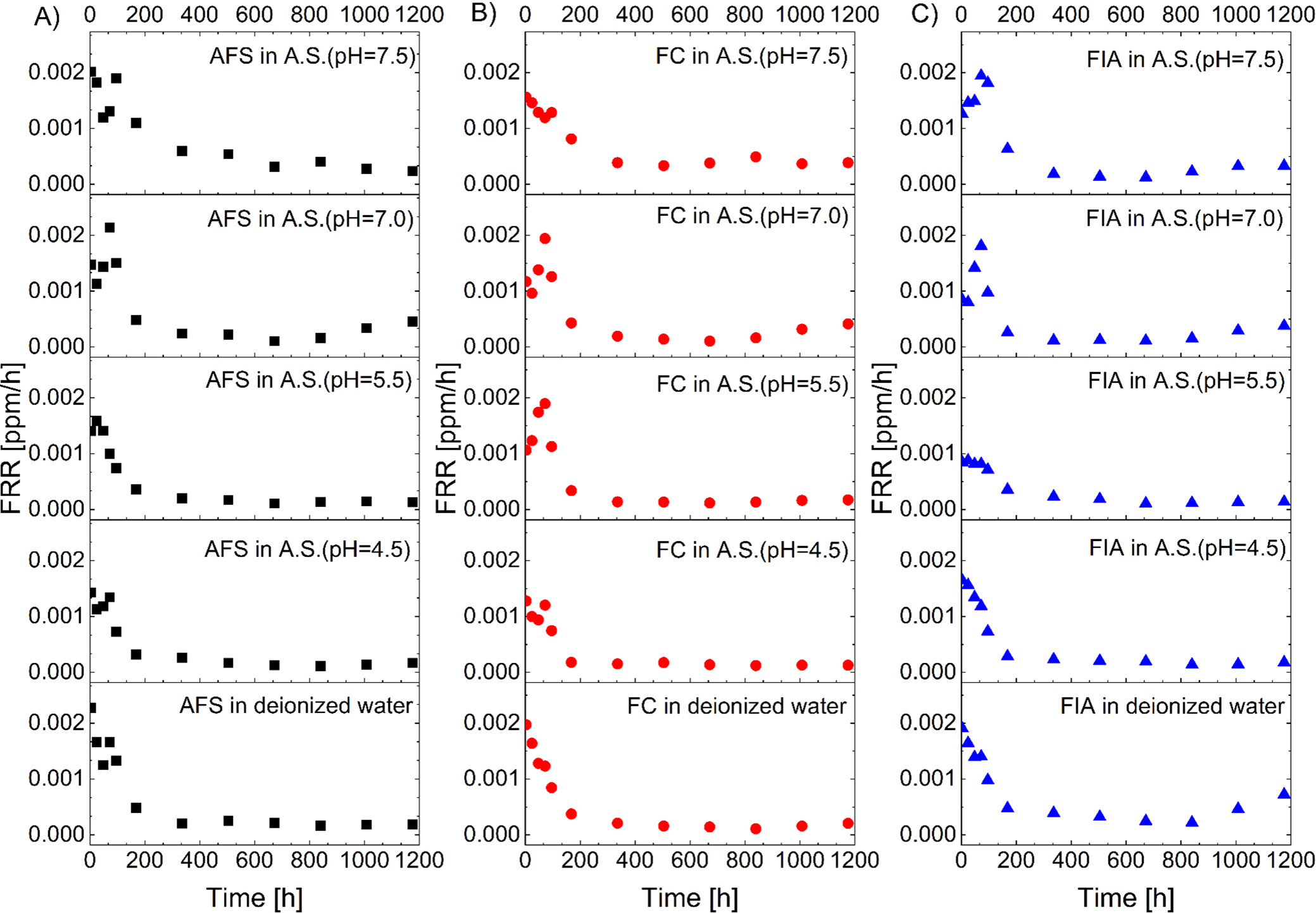 Specifically, in artificial saliva with a pH of 7.5, the IBR values were lowest (8.2–9.5%), with maximum release mostly occurring after 3 h, and a half-life of 2–3 weeks for AFS and FC, and 96–168 h for FIA. The CFRI values after 7 weeks were the highest, reaching 0.772 ppm for AFS. In artificial saliva with pH = 7.0, the IBR increased to 12.3–16.3%, with maximal release at 72 h and a half-life of 96–168 h. However, the maximum CFRI decreased. At lower pH values (5.5 and 4.5), the IBR remained elevated (11.6–17.9%) with variable timing of maximum release and shorter half-lives, mostly between 1 and 2 weeks. In deionized water, the IBR was in the upper range (14.0–17.2%), with a rapid maximum FRR at 3 h, while the half-lives were similar to those at higher pH values. Overall, the results demonstrate that the IBR, release kinetics, and half-life are influenced by both the pH and the surrounding medium. The highest initial burst and highest FRR were observed in artificial saliva and deionized water at lower pH values, while cumulative release after 7 weeks tended to decline under these conditions.