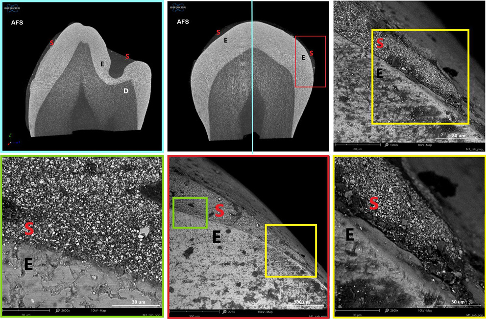 Additionally, SEM was performed to evaluate marginal sealing and identify potential micro-gaps at the enamel–sealant interface. This dual approach allowed for comprehensive visualization of both the internal interfacial integrity and the surface morphology at high resolution.