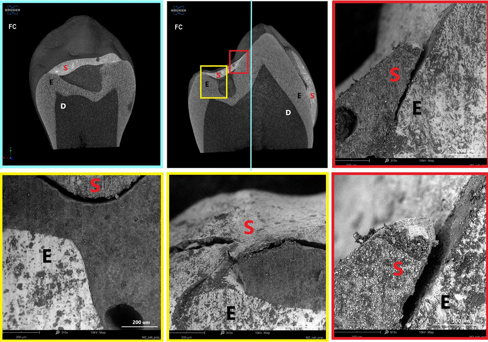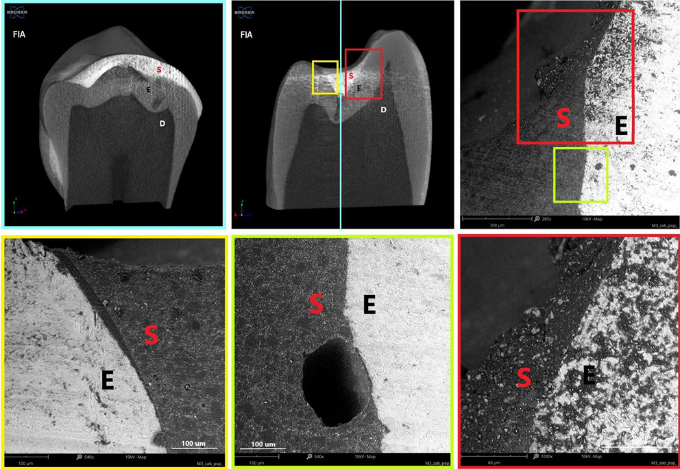 Excessive polymerization shrinkage and thermal stresses are well-known contributors to interfacial gap formation.33 Our study, employing high-resolution micro-CT combined with SEM, allowed detailed visualization of cracks and interfacial gaps induced by polymerization. These defects are not merely structural artifacts; they may serve as pathways for microleakage, facilitating microbial infiltration into the fissure system. Once microorganisms penetrate these gaps, they can proliferate, forming biofilms that are difficult to remove during routine oral hygiene. Such colonization compromises sealant integrity and increases the risk of secondary caries, underscoring the clinical importance of minimizing shrinkage and thermal stress through material selection and optimized application techniques. Correlating micro-CT and SEM data enabled precise mapping of the spatial distribution and dimensions of these defects, providing mechanistic insight into how polymerization-related stresses translate into functional vulnerabilities. Therefore, the internal structure and filler architecture of sealants appear to be key determinants in mitigating such effects.