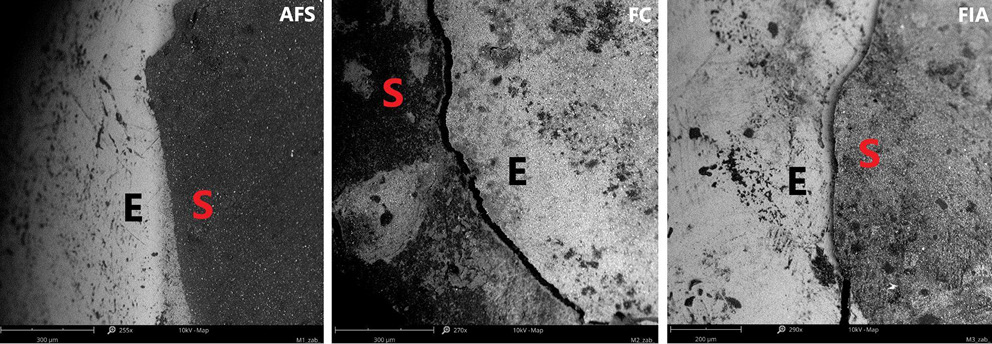 The mechanical performance of 3 commercially available fissure sealants (AFS, FC and FIA) was evaluated using instrumented indentation tests (Table 4). Parameters assessed included indentation depth (hr), Martens hardness (HM and HIT), indentation modulus (EIT), and work ratio (ηIT). These tests allowed quantification of each sealant’s resistance to mechanical deformation and its elastic response under load.