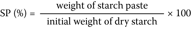 Starch slurries (1% w/v) were prepared with distilled water and heated in a water bath at 40°C for 30 min. The dispersions were centrifuged at 1500 rpm for 30 min, the supernatant was discarded, the weight of the starch paste was determined, and the swelling power (SP) was computed using the equation below (Equation 1):