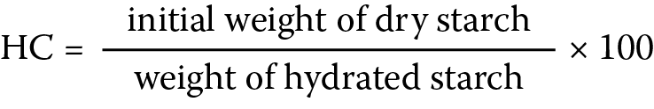 The method of Kornblum and Stoopak12 was adopted to determine the starch hydration capacity (HC). Starch dispersions (1% w/v) were prepared with distilled water, poured into pre-weighed, stoppered centrifuge tubes and shaken intermittently for 10 min. The tubes were allowed to stand for another 10 min at room temperature and then centrifuged at 1500 rpm for 5 min. The supernatant was discarded, and the weight of the sediment (hydrated starch) was determined and used to compute the HC as shown below (Equation 2):