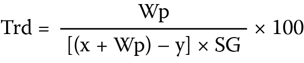 The liquid displacement method was adopted and liquid paraffin was used as the displacement fluid. Three determinations were made and the true density (Trd) was computed as shown below, where Wp is the weight of starch powder, x is the weight of the bottle and fluid, y is the weight of the bottle, fluid and starch powder, and SG is the specific gravity of liquid paraffin (0.865 g/mL) (Equation 6).