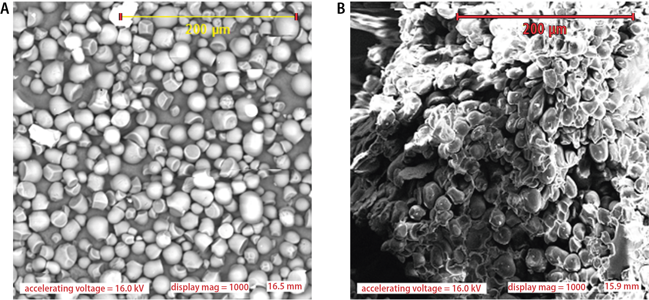 Microscopic observation of the starches using SEM revealed that NMNS is discrete, smooth, non-porous, and almost spherical in shape (Figure 1A), while the shape of NMPS is non-discrete, gel-like, rough, and irregular (Figure 1B). Granules of pre-gelatinized starch (Figure 1B) were also observed to be aggregated, which is due to granular disintegration and the subsequent release of soluble components during the thermal process of gelatinization. The particle sizes measured with SEM were 16.5 mm and 5.9 mm for NMNS and NMPS, respectively. Heating starch has been postulated to affect swelling and rupture of starch granules, which invariably affects the size of the resulting starch product.25 Furthermore, the heating process may have caused the loss of the amylopectin crystalline region, with the consequent rearrangement of bonds within the granules leading to breakdown, distortion and loss of granule integrity. These observations are in line with similar studies showing the effects of pre-gelatinization on starch morphology.26, 27