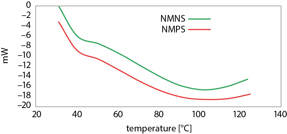 The behavior of NMNS and NMPS when subjected to heat was determined with DSC and the thermograms are displayed in Figure 4. The thermal properties of the starches such as onset temperature, peak temperature, conclusion temperature, and gelatinization enthalpy, among others, are presented in Table 5.
