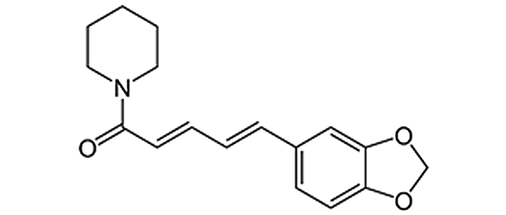 Piperine is the most abundant pungent alkaloid obtained from the fruits of P. nigrum L. and other peppers. It was first isolated by Hans Christian Ørsted in 1819 as yellow crystalline substance. Its structure was determined later. Its chemical formula is C17H19NO3 and its IUPAC name is 1-[5-(1, 3-benzodioxol-5-yl)-1-oxo-2, 4-pentadienyl] piperidine. It is slightly soluble in water and has the melting point of 128–130°C. It has 3 other geometric isomers, namely iso-piperine, chavicine and iso-chavicine, but all these lack pungency. Piperine has good pungent taste but on hydrolysis it gets converted to piperidine and piperic acid, due to which it loses its pungent nature. Piperine accounts for about 98% of the total alkaloids in peppers.6, 7