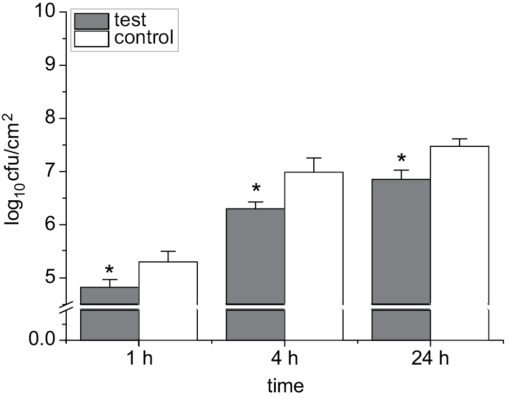 A similar procedure aimed at measuring the adhesion of B. cepacia to uncoated IDC tubes as mentioned above was followed. It allowed us to study the ability of B. cepacia to adhere to coated tubes in terms of the number (cfu/cm2) of B. cepacia that adhered to coated IDC tubes at different time intervals (1 h, 4 h and 24 h).