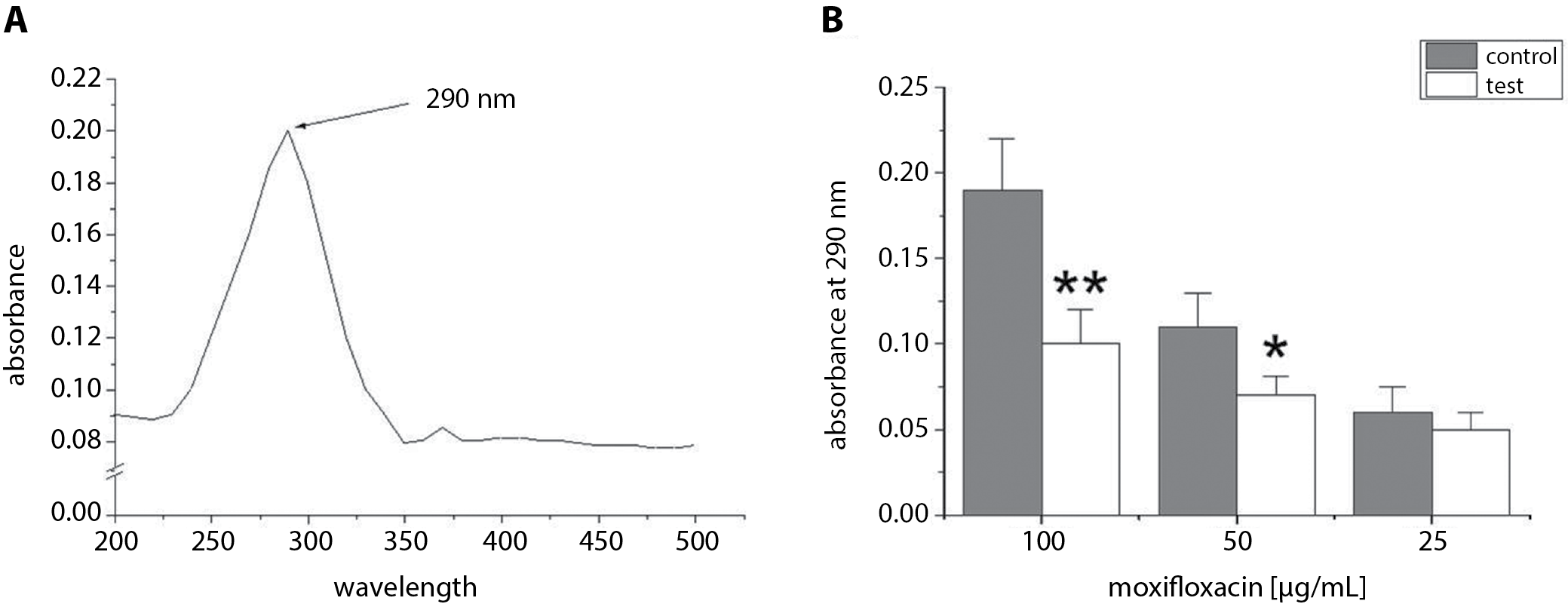 The optimum wavelength used in this experiment was estimated after studying different wavelengths to determine which one of them achieved the highest absorbance of moxifloxacin (100 µg/mL). Figure 2A shows that the maximum absorbance of moxifloxacin (100 µg/mL) was at 290 nm. This wavelength was used in further experiments to check the efficiency of adsorption of moxifloxacin to IDC tubes. The absorbance (at 290 nm) was measured in test tube solutions containing 100 µg/mL, 50 µg/mL or 25 µg/mL of moxifloxacin with IDC pieces. The test tube solutions were incubated for 24 h. The results were compared with control tubes (100 µg/mL, 50 µg/mL or 25 µg/mL of moxifloxacin without IDC pieces). Figure 2B showed that the absorbance of test tubes (50 µg/mL or 100 µg/mL of moxifloxacin and IDC pieces) at 290 nm was significantly lower than the absorbance of control tubes (50 µg/mL or 100 µg/mL of moxifloxacin without IDC pieces). No significant difference was observed between test tubes containing 25 µg/mL (p > 0.05) of moxifloxacin with IDC pieces and control tubes (25 µg/mL of moxifloxacin only). The present study showed that the best adsorption of moxifloxacin was observed after a 24-h exposure of the pieces of IDC to 100 µg/mL of moxifloxacin at room temperature. Thus, the deposition of moxifloxacin on catheters was dependent on moxifloxacin concentration. Therefore, the pieces of IDC exposed to 100 µg/mL of moxifloxacin were used to evaluate the effect of moxifloxacin-coated IDCs on B. cepacia adhesion and biofilm formation.