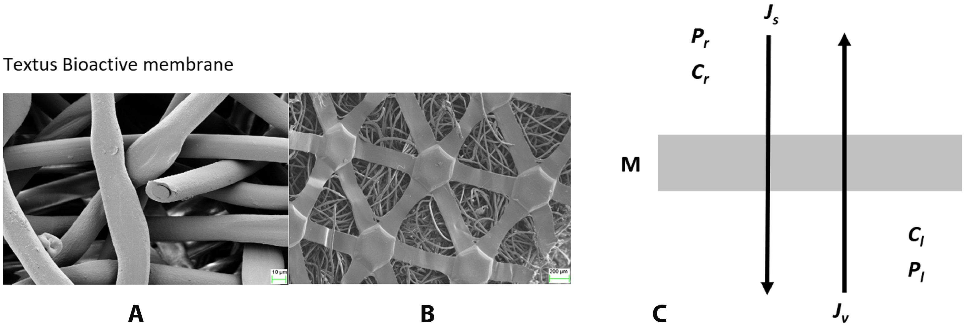 According to the Kedem–Katchalsky (KK) model, the Textus Bioactiv Ag membrane has certain transport properties measured with the coefficients of hydraulic conductivity (of the solvent), reflection and diffusive conductivity (of the solution).9 This means that the Textus Bioactiv Ag membrane can separate appropriate solutions of different concentrations and has the property of free energy conversion, similarly to Nephrophan or Bioprocess membranes.10, 11 The total energy of a thermodynamic system is the sum of its internal energy (nuclear, chemical and thermal) and external energy (connected with gravitational, electromagnetic, electrical field, etc.).12