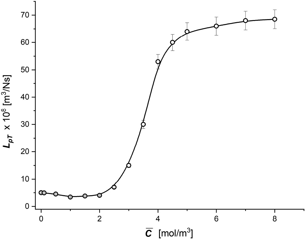 Figure 3, Figure 4, Figure 5 show the dependencies LpT = f(C), ωT = f(Δπ) and σT = f(Δπ) were suitable. In the case of the LpT = f(C) characteristic, it was assumed that C ≈ 0.5(Cr + Cl) (Cr = Cl). The characteristics shown in these figures are nonlinear. From the characteristics presented in Figure 3, it follows that LpT increases from LpT = 5 × 10−8 m3/Ns (for C = 0, pure water) to LpT = 68.5 × 10−8 m3/Ns (C = 8 mol/m3) – which is more than a 13-fold increase when concentrations of C changes from 0 mol/m3 to 8 mol/m3).