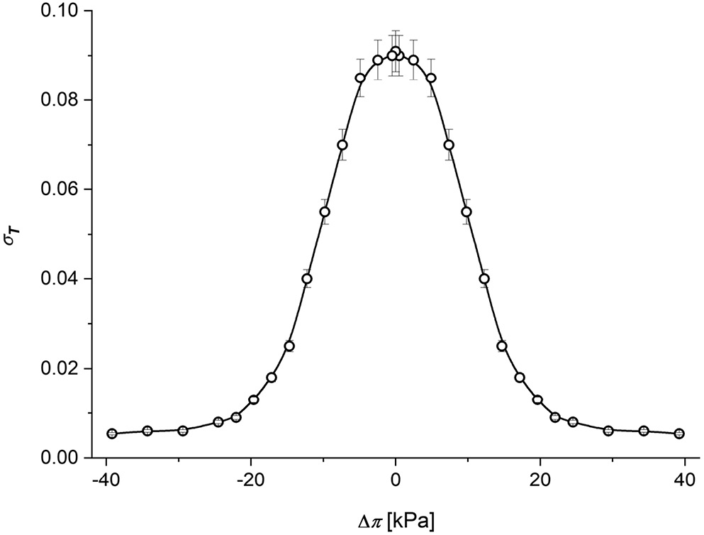 The curve in Figure 4A shows that σT decreases from 0.09 (for Δπ = ±0.86 kPa) to 0.005 (for Δπ = ±39.22 kPa) which is related to a 18-fold reduction in the reflection coefficient when the concentration in the membrane Δπ changes from 0.86 kPa to 39.22 kPa. This indicates a significant reduction in membrane selectivity for KCl solutions with increasing KCl concentrations in the membrane. This nonlinear relationship of the transport coefficients is caused by swelling of the hydrophilic fibers within the membrane and by the hydration of K+ ions. These water coatings facilitate membrane transport by reducing the friction between the membrane and the substances penetrating it, and are dependent on the concentration of the solutions. For this reason, they increase the value of LpT and ωT and decrease the value of σT.