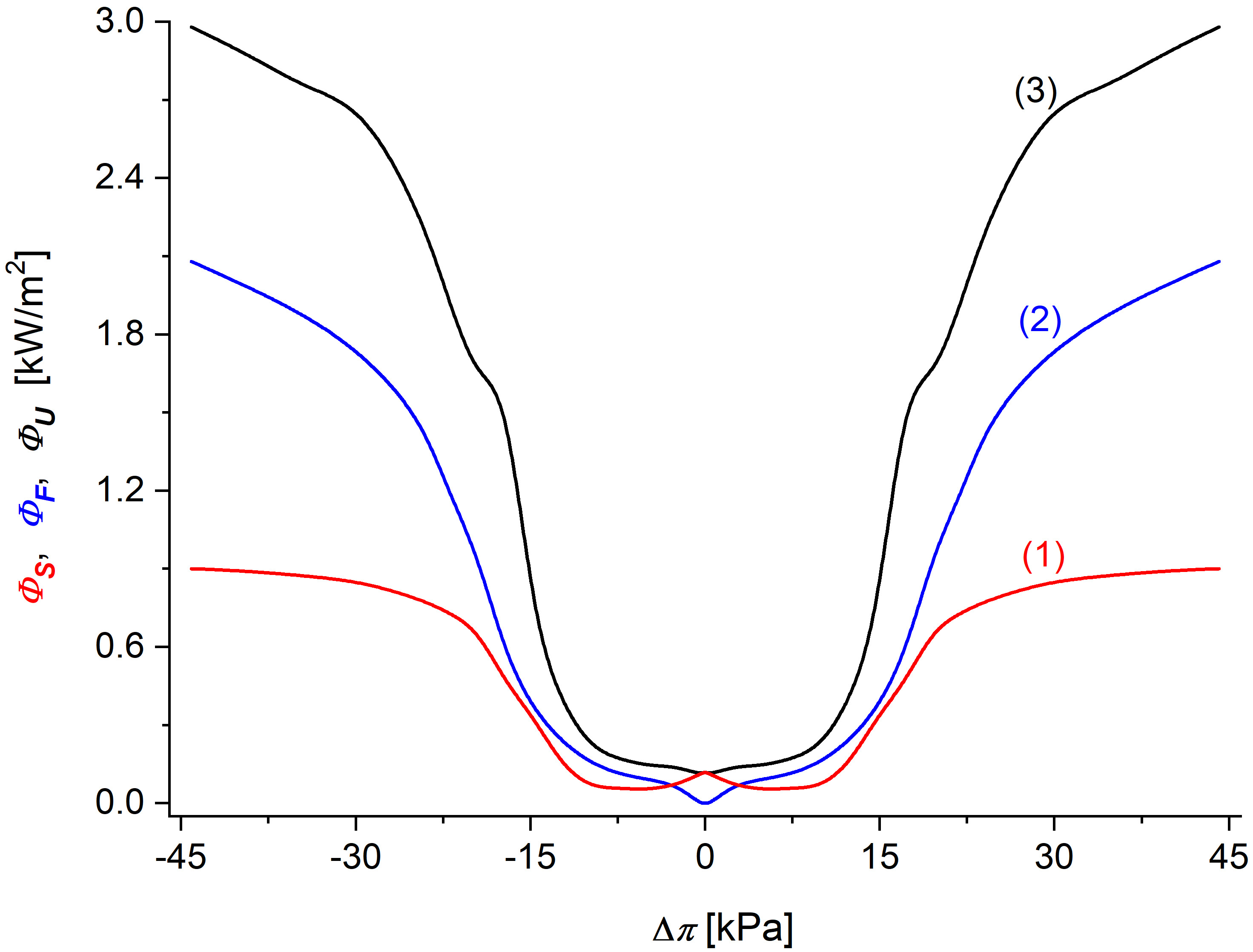 The dependencies (ΦS)L = f(Δπ), (ΦF)L = f(Δπ) and (ΦU)L = f(Δπ) calculated based on Equation 16 for the Textus Bioactiv Ag membrane are presented in Figure 8. The calculations were performed for a fixed difference of hydrostatic pressures ΔP = 40 kPa and different Δπ.
