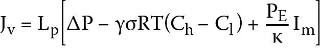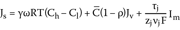 where Jv – volume flux; Js – solute flux; Im – electric ion current; Lp, σ, PE and ω – coefficients of hydraulic permeability, reflection, electroosmotic permeability, and solute permeability, respectively; ΔP = Pr – Pl – difference of hydrostatic pressure; γ – Van ‘t Hoff coefficient; Δπ = RT(Cr – Cl) – differences in osmotic pressures (RT – the product of the gas constant and the absolute temperature; Δπ = RT(Cr – Cl) are solution concentrations, Ch > Cl); γ – Van ‘t Hoff coefficient (1 ≤ γ ≤ 2); κ – electrical conductivity; τj, zj, νj – transfer number, valence and ion number, respectively; and C = (Ch − Cl)(lnChCl−1)−1 ≈ 0.5 (Ch + Cl) – average concentration of the solution.