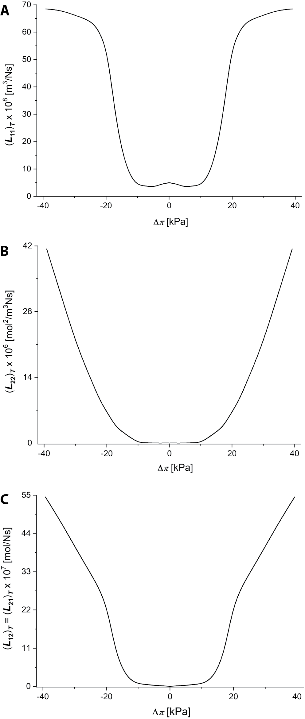 The values L11, L12 = L21 and L22 were calculated using Equation 9. Figure 6A–C show the nonlinear dependencies of (Lij)T = f(Δπ) for the Textus Bioactiv Ag membrane when (a) i = j = 1, (b) i = j = 2, and (c) i ≠ j.