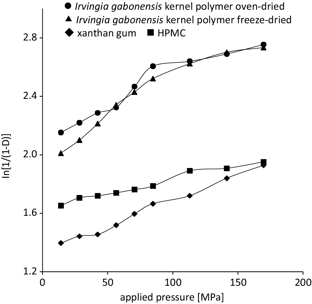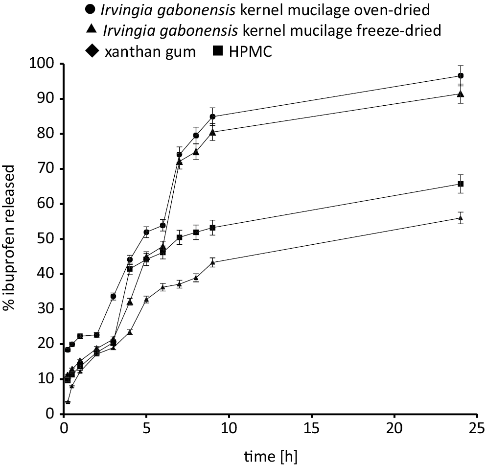 Results. Irvingia gabonensis polymer deformed plastically with a fast onset and a high amount of plastic deformation compared with xanthan gum and HPMC. This polymer was directly compressible and formed intact non-disintegrating tablets; the mechanical and dissolution properties of Irvingia gabonensis polymer tablets generally decreased with increasing concentration of ibuprofen. The ranking of dissolution times was xanthan gum > freeze-dried Irvingia gabonensis > HPMC > oven-dried Irvingia gabonensis. The addition of the excipients improved the mechanical properties of the tablets, aided ibuprofen release, and altered the release kinetics, which was largely defined by the Korsmeyer–Peppas model. Increasing the proportion of xanthan gum and HPMC in the matrices resulted in a decreased amount of ibuprofen released after 9 h, with xanthan gum having a greater effect.