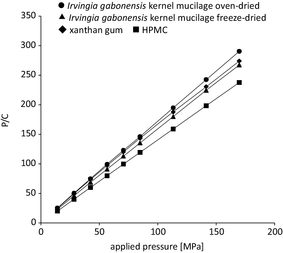 The Pk and Py are pressure parameters that are inverse measures of plasticity.29 The Py relates mainly to the onset of plastic deformation, while Pk relates to the amount of plastic deformation occurring during the compression process.13, 16 The Py values of the formulations increased with an increase in the concentration of ibuprofen whereas Pk generally decreased. This suggested that ibuprofen delayed the onset of plastic deformation but increased the total amount of plastic deformation. Materials that are brittle or easily fragmenting are known to have high Py values, while those that deform plastically or elastically typically exhibit low yield pressure.29, 30, 31 Thus, the addition of a non-polymeric material, such as ibuprofen, reduced the plasticity of the materials but increased the total amount of plastic deformation.29 The rankings for the Py values for the formulations were found to be HPMC > xanthan gum > oven-dried Irvingia gabonensis > freeze-dried Irvingia gabonensis, while the ranking for Pk was found to be xanthan gum > oven-dried Irvingia gabonensis > freeze-dried Irvingia gabonensis > HPMC. Thus, formulations containing Irvingia gabonensis polymer exhibited a faster onset of plastic deformation than HPMC and xanthan gum, and higher amounts of plastic deformation than xanthan gum, but lower deformation than HPMC. Formulations containing HPMC exhibited the slowest onset of plastic deformation while xanthan exhibited the highest amount. High plastic deformation has been related to tablets with high crushing strength and a greater ability to withstand rigorous handling.28