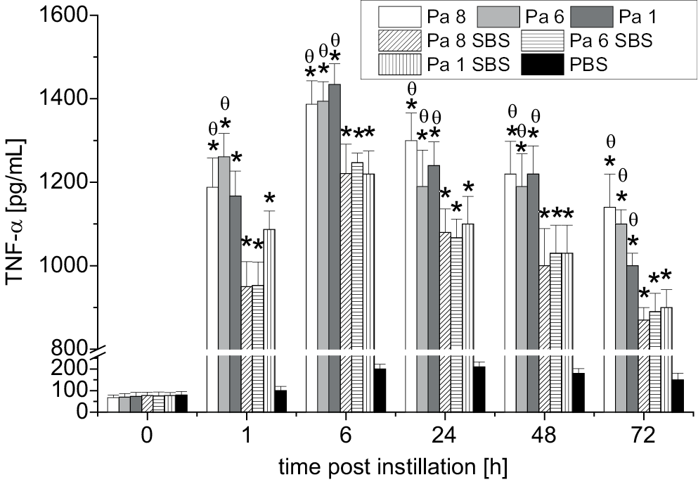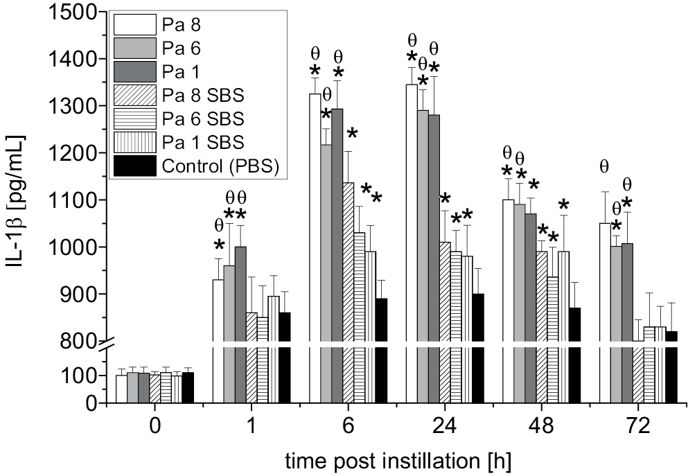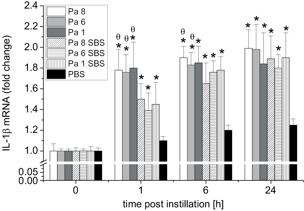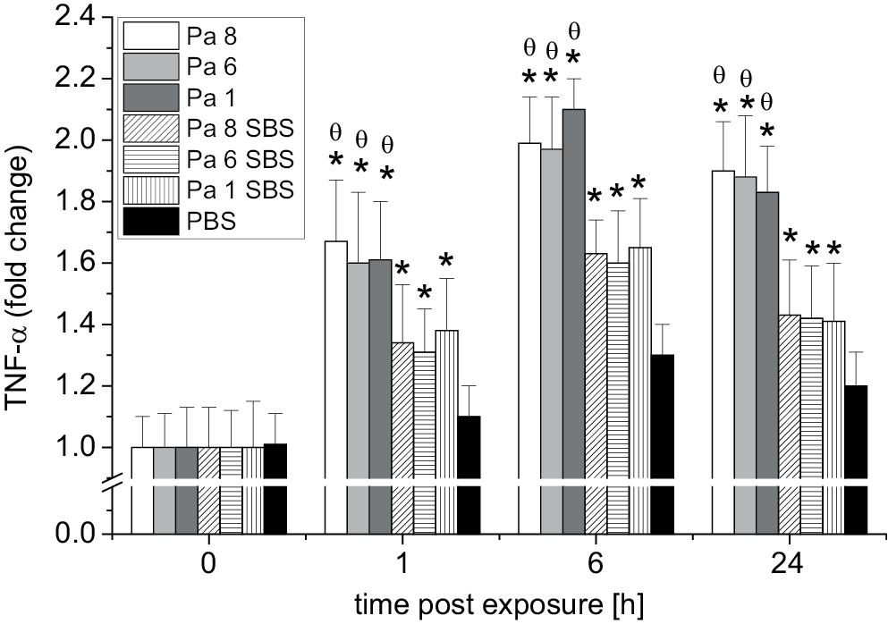 Results. Moderate (p < 0.05) elevations of IL-1β mRNA in HECs and IL-1β protein in the supernatant of the HEC culture were observed following exposure to SBS of Pa 8, Pa 2 and Pa 1 at most time points. High elevation (p < 0.05) of IL-1β was seen in the supernatant of the HEC culture that was exposed to bacterial cells (Pa 8, Pa 2 and Pa 1). Similar results were found when TNF-α mRNA was measured in HECs and TNF-α in the supernatant of the HEC cultures after exposure to bacterial cells (Pa 8, Pa 2 and Pa 1) and the SBS of Pa 8, Pa 2 and Pa 1.