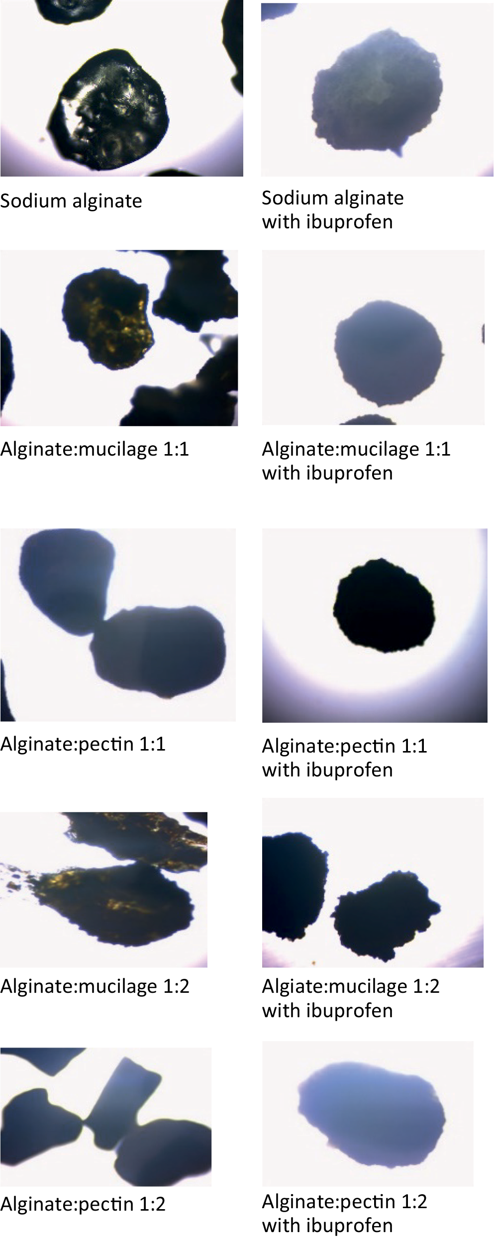Ibuprofen-loaded microspheres were created using the ionotropic gelation technique. Different batches of sodium alginate alone, as well as the polymer blends of different concentrations of alginate with mucilage and alginate with pectin in ratios 1:1 and 1:2, were prepared. Ibuprofen (1 g) was incorporated into various blends at a polymer-to-drug ratio of 2:1. The microspheres were prepared with 10% w/v zinc chloride as the crosslinking agent. The polymer mixture was extruded using a 21-G needle and a 5-mL syringe at a dropping rate of 2 mL/min and a stirring speed of 300 rpm. To begin the curing process, the microspheres were immersed in zinc chloride for 10 min. Then, they were filtered, rinsed 3 times with distilled water, dried at ambient temperature for 24 h, and further dried for 6 h at 40°C in a hot air oven (laboratory oven TT-9083; Techmel & Techmel).