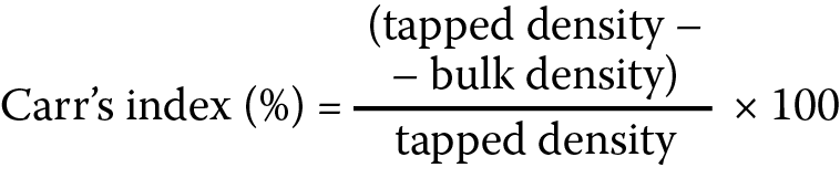 Hausner ratio was calculated by dividing the initial bulk volume by the tapped volume. The tapped volume was determined by applying 100 taps at a standardized rate of 38 taps per min to 5 g of polymer in a graduated cylinder.30