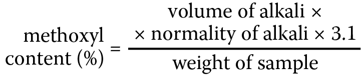 The neutralized solution produced by the titration with equivalent weight was mixed with sodium hydroxide (25 mL of 0.25 N). After thoroughly stirring the mixture, it was allowed to stand at room temperature for 30 min. The mixture was then titrated against 0.1 N NaOH using 25 mL of 0.25-N hydrochloric acid.32 Equation 5 was used to determine the methoxyl content of pectin2: