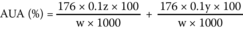 where the molecular weight of 1 unit of AUA is 176 g, z is the titer volume (mL) of NaOH is determined by equivalent weight, and y is the titer volume (mL) of NaOH is determined by methoxyl content determination, while w is the weight of the pectin sample.