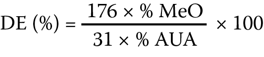 The degree of esterification was calculated from the percentage of methoxyl content (MeO) (Equation 5) and % AUA (Equation 6) using Equation 7: