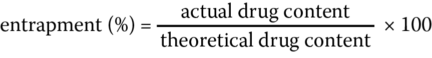 Ibuprofen-loaded microspheres (50 mg) were crushed with a mortar and pestle, and then suspended in a 10 mL of phosphate buffer with a pH of 7.2 and filtered after 24 h. The phosphate buffer was then used to dilute the filtrate before it was examined at 221 nm with a spectrophotometer. The following formula was used to compute the drug entrapment efficiency (Equation 8):