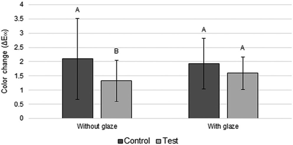 Results. The ΔE00 of the unglazed control group was significantly higher than that of the unglazed test group. In all groups, a significant decrease in microhardness occurred over time. At both times, the glaze significantly increased the microhardness of the specimens (in all the glazed groups). At the final time, the test glaze group showed significantly higher microhardness compared with the control glaze group. Roughness in the groups without glaze increased significantly with CHX treatment over time. At both times, the glaze generated a significant reduction in roughness in the control and test groups. There was a significant reduction in surface energy over time in all groups. In most comparisons, the glazed groups showed significantly higher surface energy values compared with the unglazed control group. At the final time point, the unglazed test group showed a significantly higher surface energy value than the unglazed control group; and the glazed test group showed a significantly higher surface energy value compared with the glazed control group. The resins that received CHX had a significantly lower amount of biofilm.