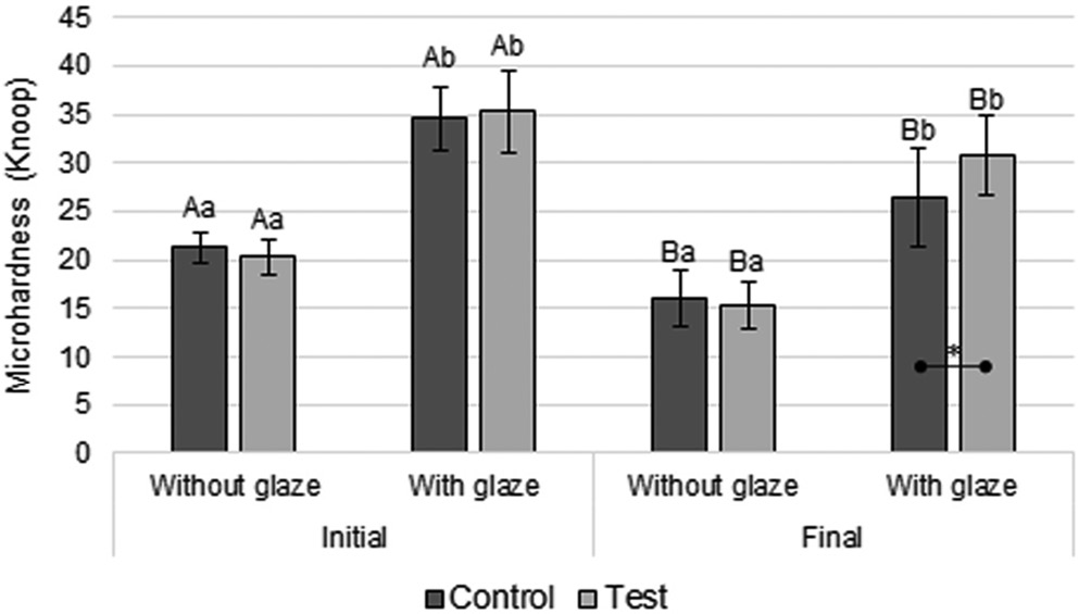 (p < 0.001) and time (p < 0.001) factors, and the interaction between the glaze and disinfection (p = 0.007) and time and disinfection (p = 0.040) were statistically significant (Table 2). In all groups (Figure 2), a statistically significant decrease in microhardness was observed over time. At each time point (initial and final), the groups with the glaze showed a significantly higher microhardness than the groups without the glaze (Figure 2). At the final time point, the test glaze group showed significantly higher microhardness compared with the control glaze group (Figure 2).