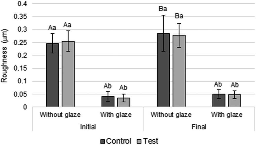 When analyzing surface roughness, ANOVA showed that the interaction between time and glaze factors showed statistical significance (p = 0.033) (Table 3). The roughness values in the groups without glaze (control and test) increased significantly over time (Figure 3). In addition, at both time points, the glazed groups showed significantly lower roughness than the unglazed ones (Figure 3).
