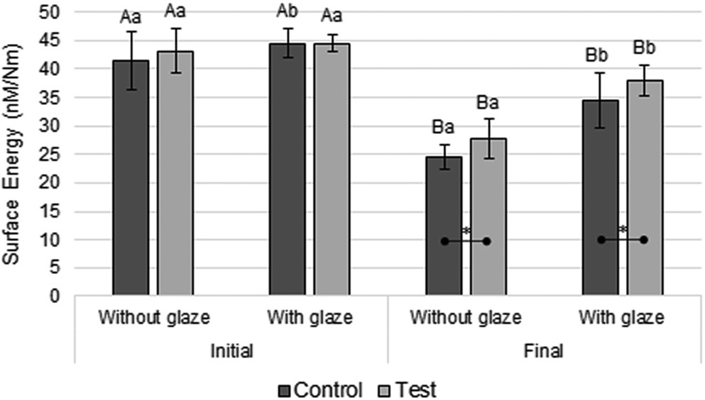 Regarding surface free energy, ANOVA showed that the interaction between time and glaze (p < 0.001) and time and disinfection (p = 0.026) were statistically significant (Table 4). Figure 4 shows that there was a significant reduction in surface energy over time in all groups. At the initial time point, the glazed control group showed significantly higher surface energy value compared with the unglazed control group (Figure 4). At the final time point, the glazed groups showed significantly higher surface energy values than the unglazed ones (Figure 4). In addition, at the final time point, the unglazed test group showed a significantly higher surface energy value than the unglazed control group; and the glazed test group showed a significantly higher surface energy value compared to the glazed control group (Figure 4).