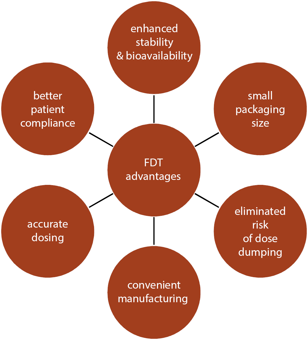 The FDTs have uniform advantages such as exceptional stability, ease of manufacturing and handling, good patient compliance, enhanced bioavailability and palatability, and accurate dosing.11 They are susceptible to humidity and temperature, and are suitable for patients that suffer from dry mouth and are on anticholinergic therapy. Moreover, FDTs disintegrate quickly and exhibit speedy absorption in the oral cavity. Such tablets lead to an increase in drug bioavailability, avoid first-pass metabolism and result in reduced dosing.9, 12 Some of the key advantages of FDTs are depicted in Figure 1.