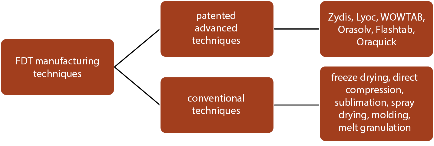 There are different patented and conventional manufacturing techniques for the preparation and development of FDTS, and several of them are listed in Figure 2.13 Table 1 summarizes the patented techniques used for the preparation of FDTs alongside their active ingredients and patent owner details.13, 14, 15, 16, 17, 18