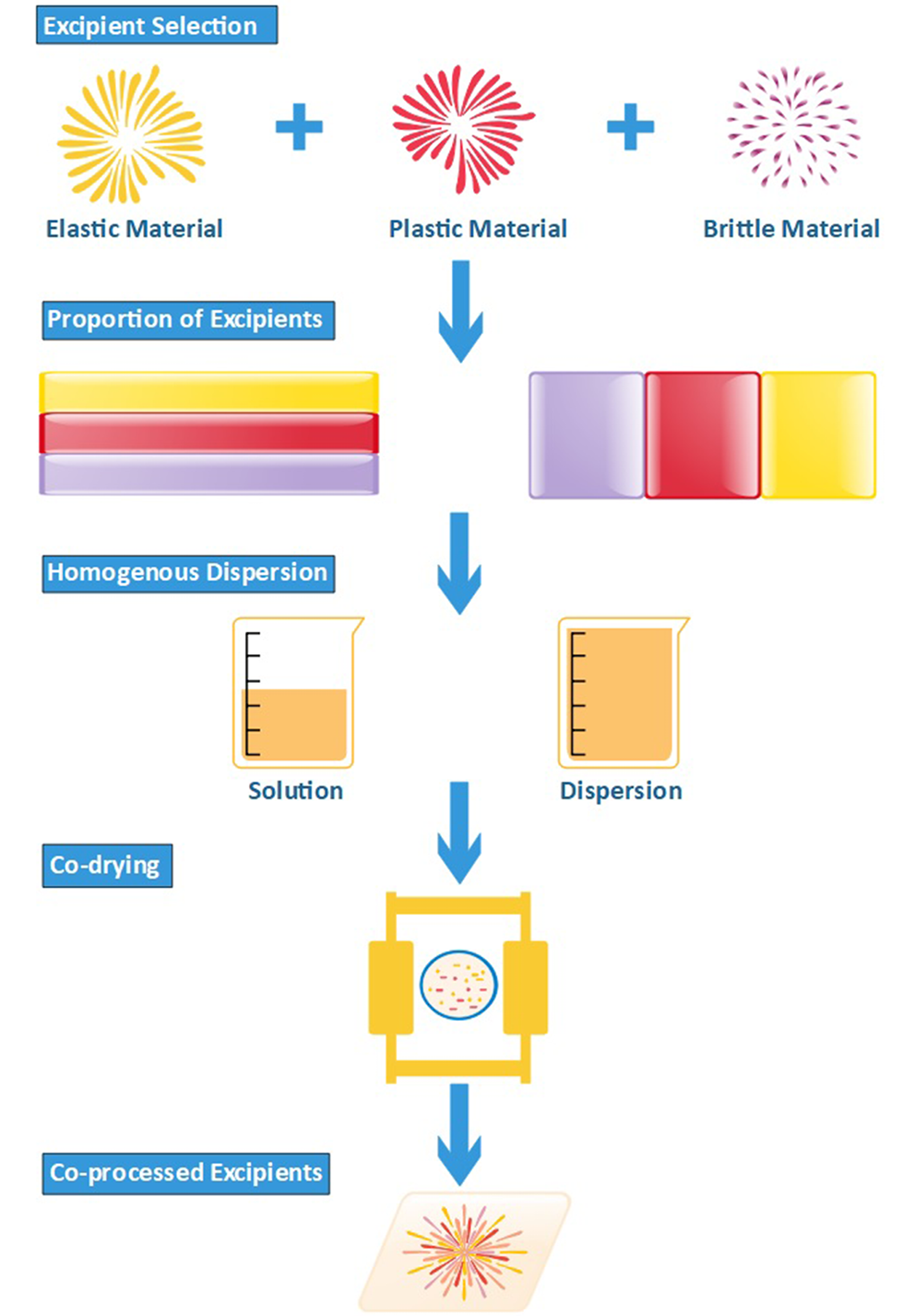 Co-processed excipients are a mixture of 2 or more compendia/non-compendial excipients that improves physical characteristics without any significant chemical transformations or displaying multifunctional activity.38 Diverse co-processing methods are used in pharmaceutical industries, such as spray drying, solvent evaporation, crystallization, melt extrusion, and many more.39, 40, 41 Co-processed excipients are developed through inclusion of one excipient into the particle framework of another (second) excipient by employing techniques such as co-drying.42 These excipients are designed to address the divergent pitfalls in flowability, compressibility, disintegration potential, lubricant sensitivity, solubility, and permeability, and boost the desired properties of excipients as well as promote production procedure at low expenditure.40, 43