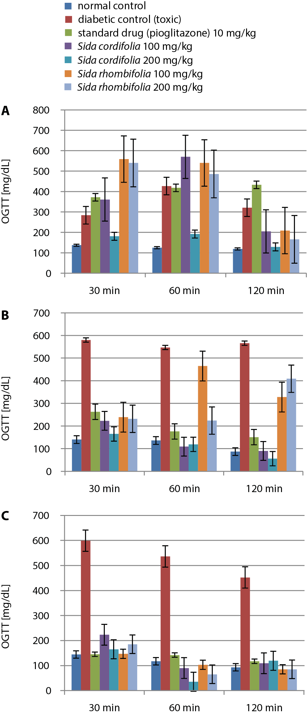After conducting the oral glucose tolerance tests (OGTT) on day 7, we observed a similar reduction of glucose levels in the S.cordifolia (200 mg/kg) administered group along with the pioglitazone administered group at different time points of 30 min, 60 min and 120 min. Similarly, the group treated with S. cordifolia (200 mg/kg) had significantly decreased levels of glucose in the same timeframe. Other extracts caused increased oral glucose tolerance at a dosage of 200 mg/kg, except for S. rhombifolia, which considerably reduced the oral glucose tolerance in rats.