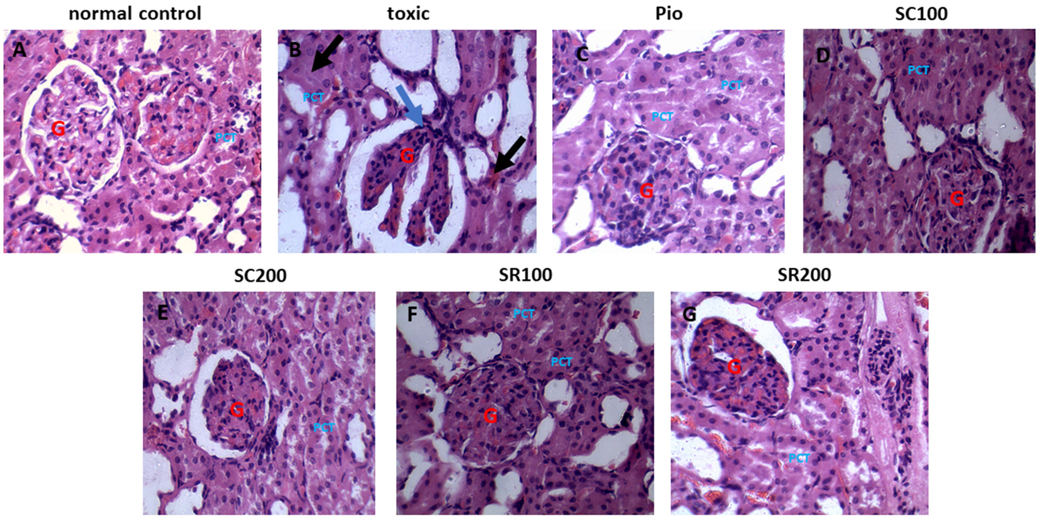 The rats in the normal control group exhibited normal Bowman’s capsules and parenchyma, with renal glomeruli enclosed by the distal and proximal tubules. The rats with STZ-induced diabetic nephropathy had severe congestion and hemorrhage of glomerular tufts, cloudy and swollen renal tubules, lymphocytic cell infiltration around glomeruli, and renal tubules with edema in the interstitial tissue. The pioglitazone-treated group had almost normal glomeruli and renal tubules. Sida cordifolia- (100 mg/kg and 200 mg/kg) and S. rhombifolia- (100 mg/kg and 200 mg/kg) treated animals showed less congestion and hemorrhage of glomerular tufts and some mildly swollen tubules. The S. cordifolia-treated group (200 mg/kg) also demonstrated protection against diabetic nephropathy, which was indicated by a decrease in atrophy, thickness of membranes and mesangial enlargements. Before the onset of microalbuminuria, oxidative stress in combination with persistent hyperglycemia may play an essential role in the etiology of tubular, glomerular, structural, and functional anomalies. Figure 7 depicts the histopathological changes observed in the kidneys of different groups.