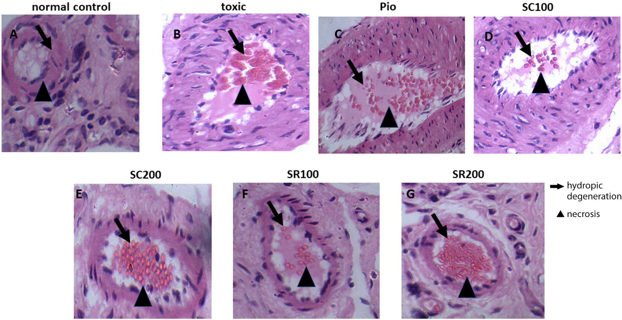 The normal control group was vehicle-treated and had a normal histological structure. The diabetic control group revealed atrophy in the islet of Langerhans, as well as degeneration and necrosis of islet cells. The group treated with pioglitazone (10 mg/kg/day) and S. cordifolia (200 mg/kg/day) had normal structures. The group treated with S. cordifolia (100 mg/kg/day) displayed atrophy, degeneration and necrosis in the islet of Langerhans. Sida rhombifolia treatment (100 mg/kg/day) resulted in a very mild atrophy in the islet Langerhans, along with the degeneration of islet cells and a little necrosis. Sida rhombifolia-treated rats (200 mg/kg/day) had a normal histological structure, although degeneration in islet cells and a little necrosis were observed. Figure 8 depicts the histopathological changes observed in the pancreatic tissue of the control and treatment groups.