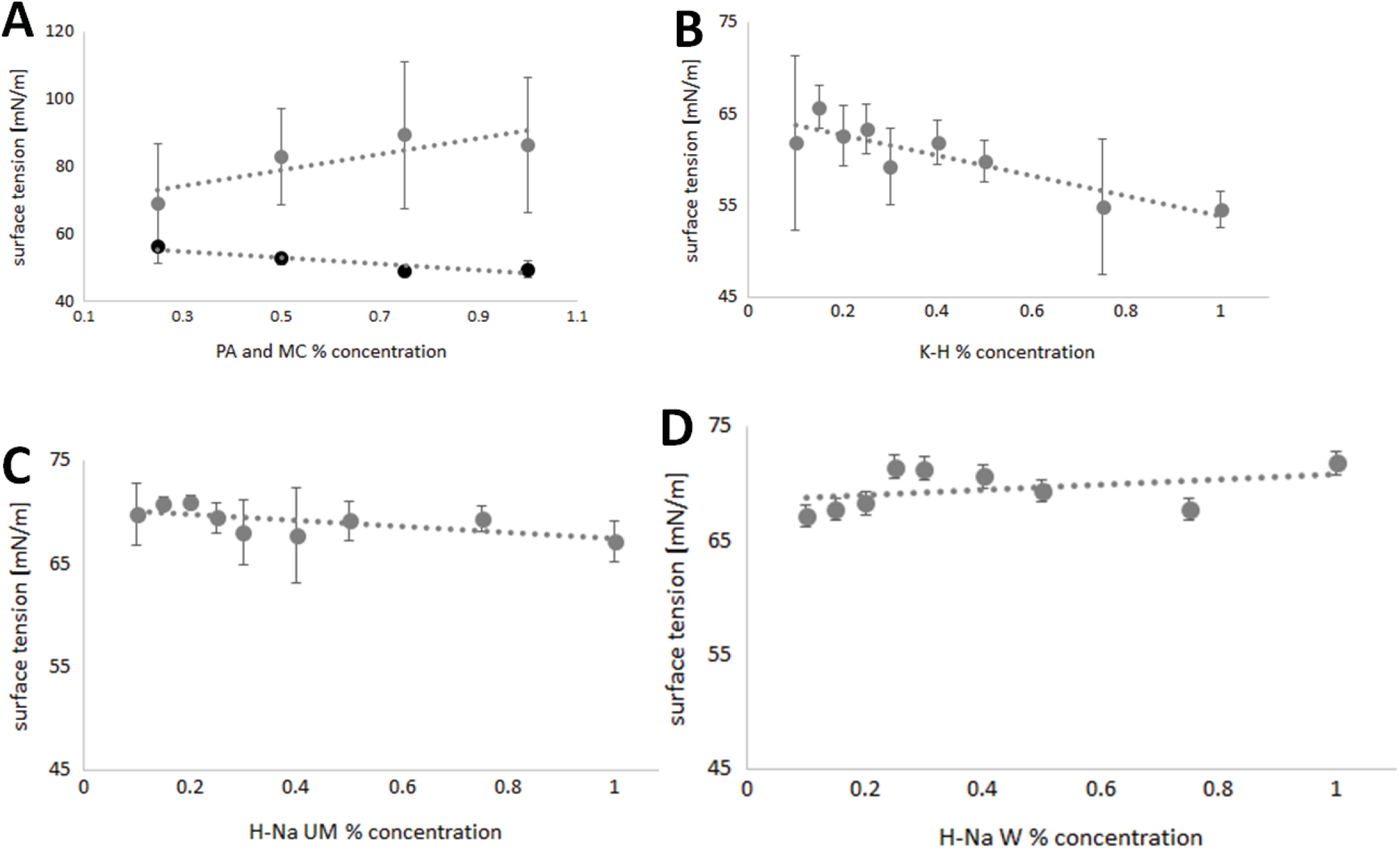 Changes in the surface tension values of different concentrations of PA are shown in Figure 2A. The highest surface tension was observed for the 0.25% solution. The decrease in surface tension is clearly visible in solutions with higher concentrations except for the 1.0% solution. The surface tension values are in the range of 48.89–56.03 mN/m. In Figure 2A, we can observe clear differences in the surface tension of MC solutions. The surface tensions of solutions with concentrations from 0.25% to 0.75% have an increasing trend, while the tension of the 1.00% solution is lower than the previous one by 2.96 mN/m. Figure 2B–D shows the surface tension values of K-H, H-Na UM, and H-Na W solutions. The surface tension values of K-H decrease with increasing concentration, oscillating in the range of 54.54–65.66 mN/m. In the H-NA UM solutions, the lowest surface tension values were recorded for concentrations of 0.30% and 0.40%. The minimum surface tension result was 67.18 mN/m and the maximum was 70.97 mN/m. Pointing out the surface tension of H-Na W, it can be observed that clearly the highest surface tension is shown by the 0.25% and 1.00% solutions: 71.43 mN/m and 71.73 mN/m, respectively. The smallest values are shown by the 0.10% solution: 67.09 mN/m.