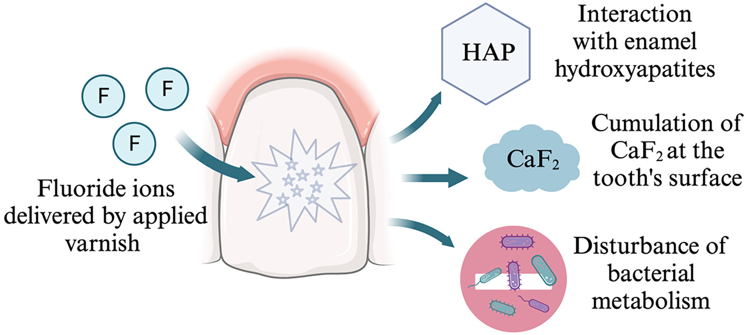 Fluoride ions released by fluoride varnishes have a direct effect on the processes occurring on the surface of the enamel in the oral environment. More specifically, they inhibit demineralization, promote remineralization and interfere with the adhesion and metabolism of carious bacteria.12, 14, 15, 29, 44, 73, 74