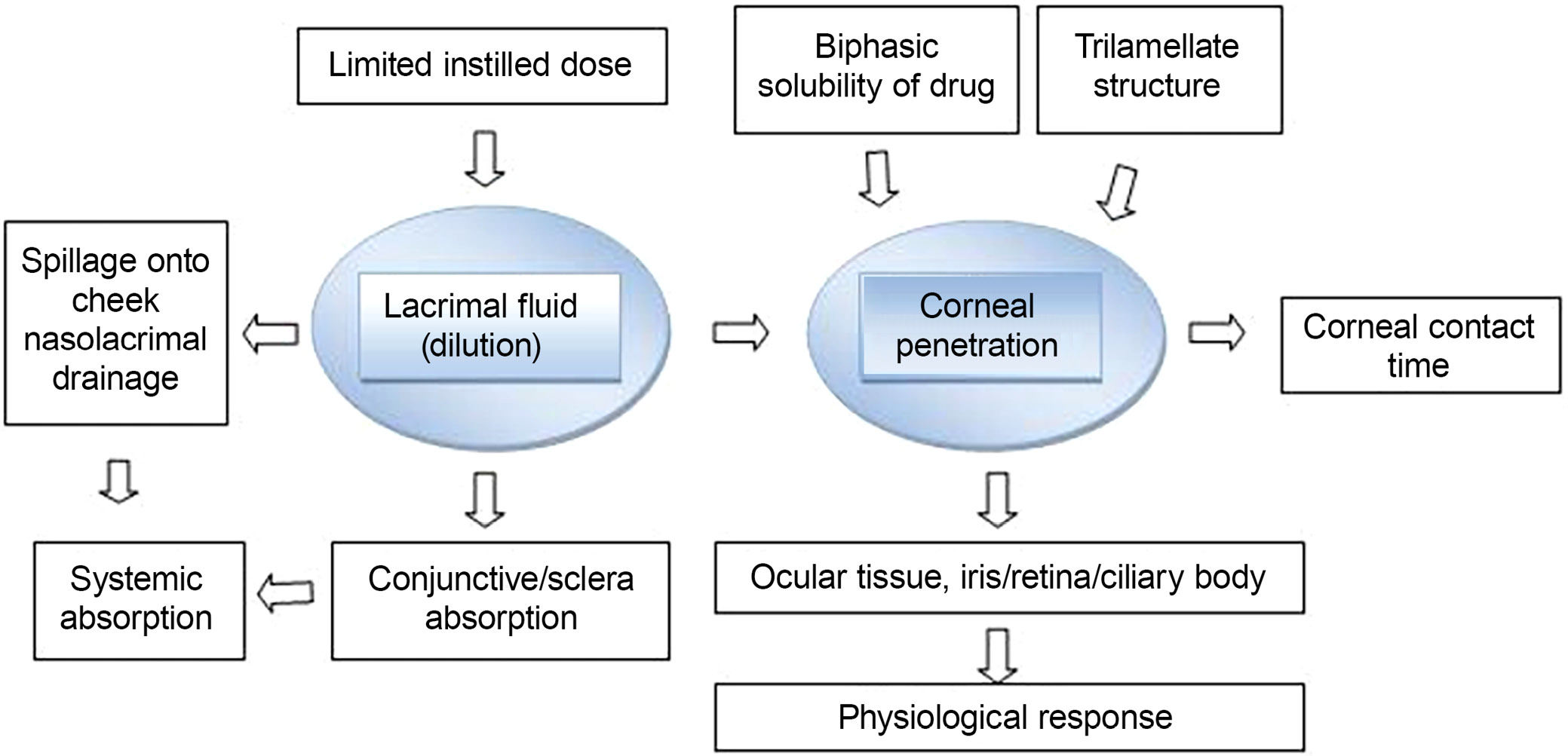 Although many medications are effective in treating the majority of ocular diseases, there are numerous ocular barriers, including tear film, corneal, conjunctival, and blood–ocular barriers, which limit the therapeutic efficiency of these medications. Both tear production and blinking deplete conventional eye drops. The bioavailability of these drugs is thereby reduced by 90%. As per ocular delivery concern, the first rate-limiting step is cornea. Therefore, to achieve higher bioavailability of therapeutic agent at any dose, the minimal penetration is achieved through the cornea. The cornea is made up of epithelium, stroma and endothelium. Only tiny, lipophilic medications can pass through epithelium, but hydrophilic medications can flow through the stroma. The endothelium protects the corneal transparency and allows for the targeted entrance of hydrophilic medicines and macromolecules into the aqueous humour.4, 5 Comparatively speaking, the conjunctiva has less of an impact on drug absorption than the cornea, yet specific macromolecular nanomedicines, peptides and oligonucleotides easily reach the deep layers of the eye through these tissues. Xenobiotic substances cannot enter the bloodstream because of the blood–ocular barriers. The blood–aqueous barrier (BAB) is found in the anterior portion of the eye, and the blood–retinal barrier (BRB) is found in the posterior segment.