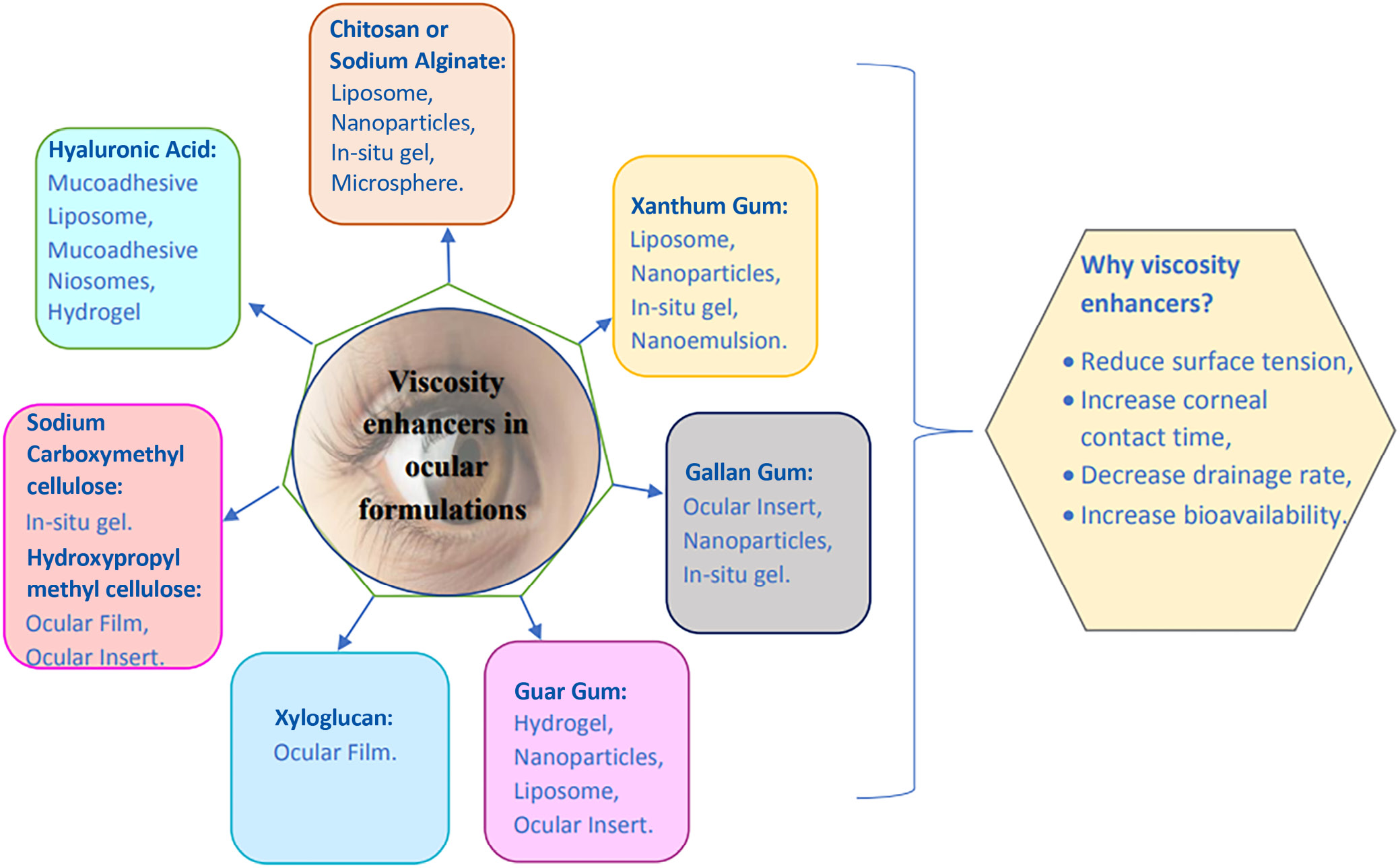 The eye is the most accessible site for topical drug delivery. Drug’s ocular bioavailability is quite low when administered topically as eye drops. Viscosity enhancers are used to increase ocular bioavailability by extending the precorneal residence time of the drug at the ocular site. Cellulose, polyalcohol and polyacrylic acid are examples of hydrophilic viscosity enhancers. The addition of viscosity modifiers increases the amount of time the drug is in contact with the ocular surface. Several polysaccharides have been studied as excipients and viscosity boosters for ocular formulations, including cellulose derivatives such as chitosan (CS), xyloglucan and arabinogalactan (methylcellulose, hydroxyethylcellulose, hydroxypropylmethylcellulose (HPMC), and sodium carboxymethylcellulose). Viscosity-increasing substances reduce the surface tension, extend the corneal contact time, slow the drainage, and improve the bioavailability. Chitosan is a viscosity enhancer that was originally thought to open tight junction barrier cells in the epithelium. Chitosan thickens the medication solution and allows it to penetrate deeper. Alginate is an anionic polymer with carboxyl end groups that has the highest mucoadhesive strength and is used to improve penetration. Carboxymethylcellulose (CMC), a polysaccharide with a high molecular weight, is one of the most common viscous polymers used in artificial tears to achieve their longer ocular surface residence period. Hyaluronic acid (HA) is biocompatible and biodegradable in nature, and it is available in ocular sustained-release dose forms. A polymer known as xanthan gum is used to increase viscosity. At 0.2% concentration, carbomer forms a highly viscous gel.