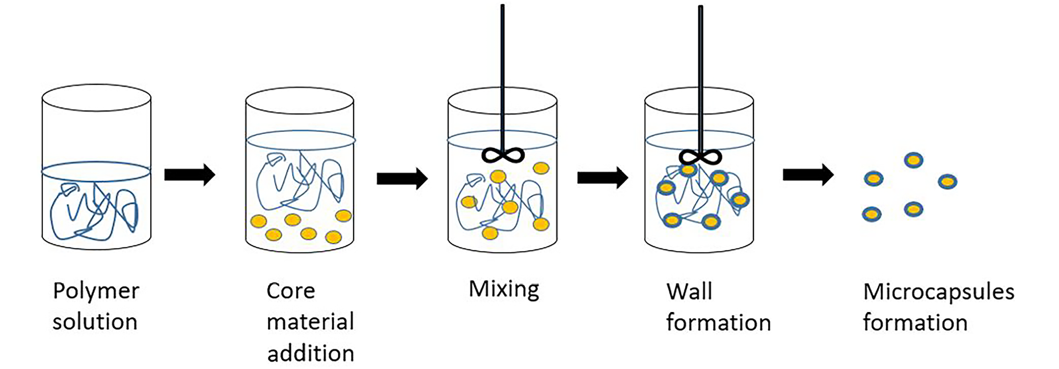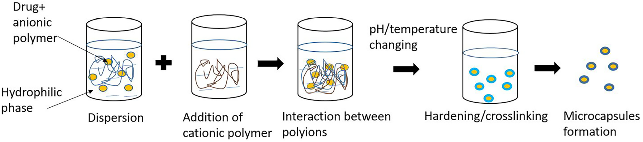 Coacervates are nothing more than large micelles that form spontaneously in colloid solutions. First attempts of microencapsulation via phase coacervation were undertaken in 1931 by Bungenburg de Jong and Kass.19 It was thanks to their research that the first gelatin capsules were created. Coacervates are formed by combining oppositely charged particles, such as polysaccharides, proteins or ions. Another definition states that coacervation is the macromolecular separation of a solution into 2 immiscible phases that are in equilibrium. It is important that the ionic substances contained in the mixture differ in their isoelectric points.20 Coacervation can be divided into simple coacervation, the simplified model of which is limited to the use of one dispersed colloidal substance (such as gelatin or chitosan), and complex coacervation, in which an aqueous solution of a polymer and an oppositely charged colloid (e.g., gum arabic) are prepared (Figure 1). It proceeds in 4 stages: