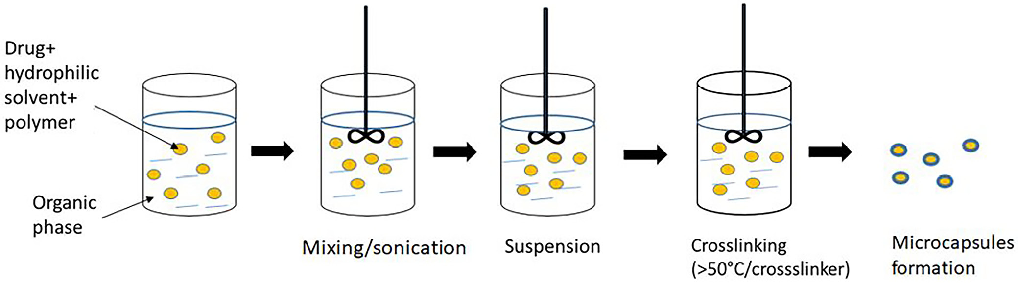 Suspension crosslinking is a preferred method for the preparation of protein and polysaccharide microcapsules.35 It involves dispersing an aqueous solution of the polymer, which contains the core material, in an immiscible organic solvent (suspension/dispersion medium) to form small droplets. The suspension medium typically contains a suitable stabilizer to preserve the integrity of the droplets or microcapsules. The droplets are then hardened with covalent crosslinking, resulting in the formation of the corresponding microcapsules. The crosslinking process can be achieved either thermally (at temperatures above 50°C) or by using a crosslinking agent, such as formaldehyde or terephthaloyl chloride (Figure 2). Suspension crosslinking is a highly versatile technique, suitable for microencapsulation of soluble, insoluble, liquid or solid materials, and can be used to produce both microcapsules and nanocapsules. For instance, albumin nanocapsules containing doxorubicin and magnetite particles have been synthesized using this method.36