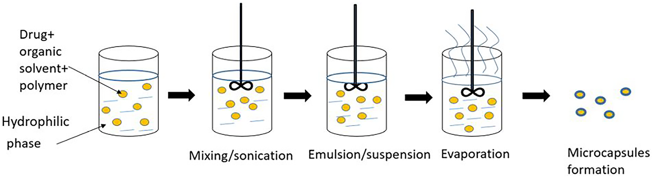 Microcapsule formation by solvent evaporation is similar to suspension crosslinking, but typically involves the use of hydrophobic polymers.37 In this method, the polymer is dissolved in a water-immiscible volatile organic solvent (dichloromethane or chloroform), into which the core material is also dissolved or dispersed. The resulting solution is then added dropwise to a stirring aqueous solution containing a suitable stabilizer, such as poly(vinyl alcohol) or polyvinylpyrrolidone, to form small polymer droplets that contain the encapsulated material. Over time, the droplets harden, forming the corresponding polymer microcapsules. The hardening process is achieved by removing the solvent from the polymer droplets through solvent evaporation (using heat or reduced pressure) (Figure 3). The solvent evaporation process is well-suited for the preparation of drug-loaded microcapsules, especially those based on biodegradable polymers. Some of the biodegradable polymers most commonly used as matrices for controlled drug release are poly(lactic acid) (PLA)38, 39 and poly(DL-lactic-co-glycolic acid) (PLGA).40 Microcapsules are produced by dispersing the drug with the polymer and a hydrophilic solvent, such as water or ethanol, using ultrasound. Direct dispersion to form a suspension can occur, as in the case of doxorubicin and PLA.38 The drug can also be pre-dispersed with an emulsifier such as dichloromethane to form a solid-in-oil (s/o) emulsion, in order to be subsequently dispersed with a polymer, as is the case of insulin dispersed using PLGA copolymer.40 In both cases, microcapsules are formed after evaporation of the hydrophilic solvent.