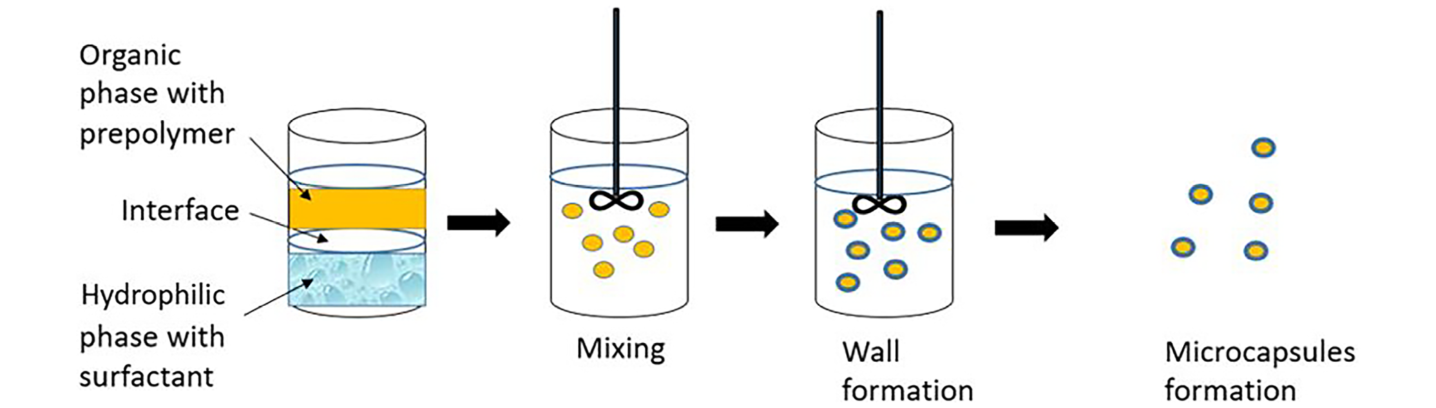 Interfacial polymerization (formerly referred to as ‘interfacial polycondensation’) was first discovered by Emerson L. Wittbecker and Paul W. Morgan in 1959 as an alternative to the typical high-temperature, low-pressure polymerization technique. This first interfacial polymerization was carried out using the Schotten–Baumann reaction, a method for synthesizing amides from amines and acid chlorides.47 This process involves dissolving reactive monomers or prepolymers in 2 immiscible phases. After the formation of droplets through dispersion, polymerization occurs at the phase boundary, leading to the formation of microcapsules (Figure 5).48 This technique has been employed to produce relatively small capsules (3–6 mm) and has found applications in pharmaceuticals and food products.49, 50, 51 A notable limitation of this approach is that the formation of a thin interfacial polymer layer between the reactants can impede further reaction progress, potentially leading to the formation of microcapsules with compromised mechanical integrity.52 Moreover, the presence of the reactive monomer within the core phase may pose a risk to the encapsulated substances. Additionally, the diffusion of monomers into the core phase may promote the formation of solid microspheres rather than microcapsules.53