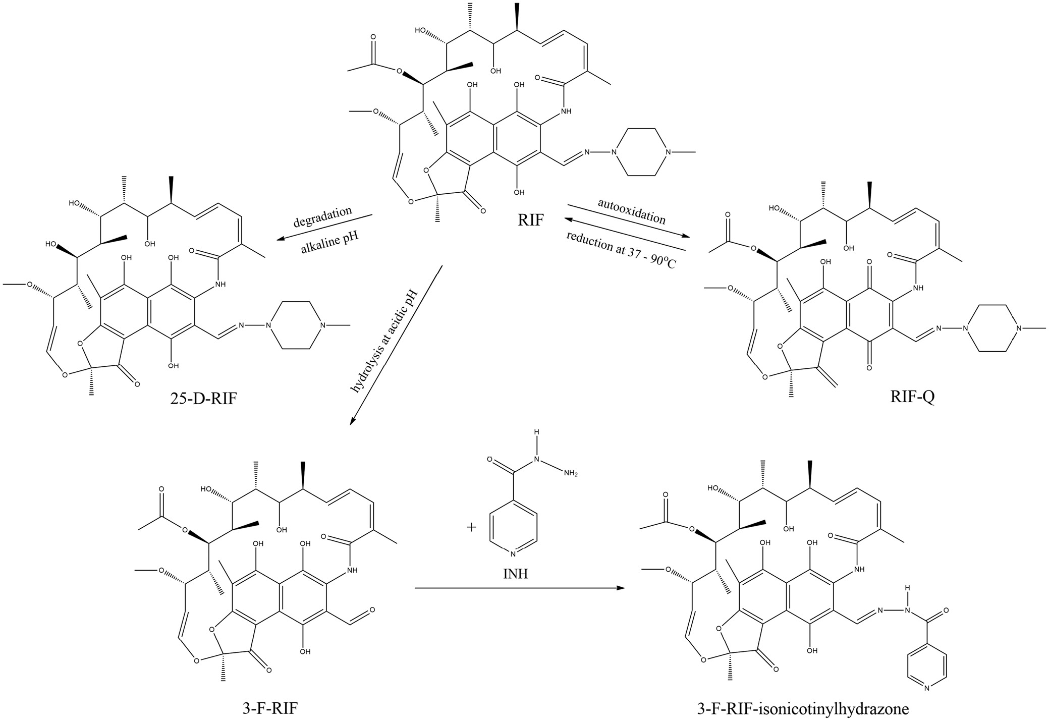 The RIF is a lipophilic substance with a partition coefficient log p-value of 2.77 and a pKa of 1.7 and 7.9 related to the 4-hydroxy and 3-piperazine nitrogen, respectively.20 The stability of the drug is pH-dependent. In neutral pH, the drug is stable, whereas in acidic and basic pH, its decomposition was observed (Figure 1). At low pH, RIF undergoes decomposition to 3-F-RIF, which is poorly soluble and contributes to the reduced bioavailability of RIF. The compound possesses high activity against Mycobacterium tuberculosis in vitro but not in vivo. At acidic pH of stomach and in the presence of INH, the degradation process of RIF is even more pronounced. Interaction between RIF and INH leads to the formation of the isonicotinyl hydrazone derivative of 3-F-RIF (3-F-RIF-isonicotinylhydrazone; Figure 1) and subsequent production of hydrazine and 1-amino-4-methyl-piperazine.11 Sankar et al.21 showed that degradation of RIF and INH is caused by interaction between the compounds in fasting pH conditions under which combination of both drugs are administered. At pH 2 (the maximum pH in the fasting condition) and in 50 min, RIF decomposed by approx. 34%, while INH by 10%. The extent of decomposition for RIF and INH ranged between 13–35% and 4–11%, respectively, in several marketed formulations.